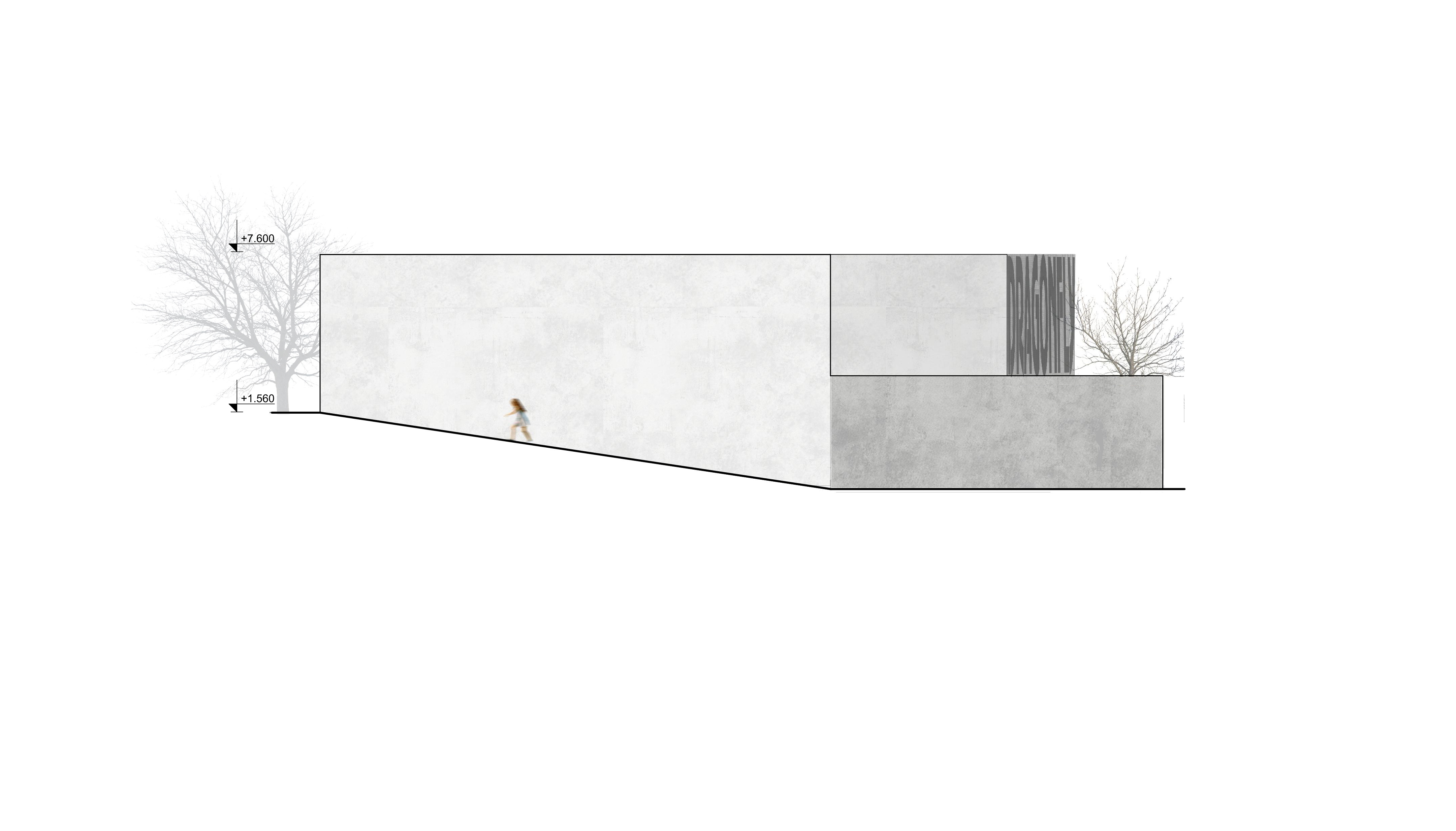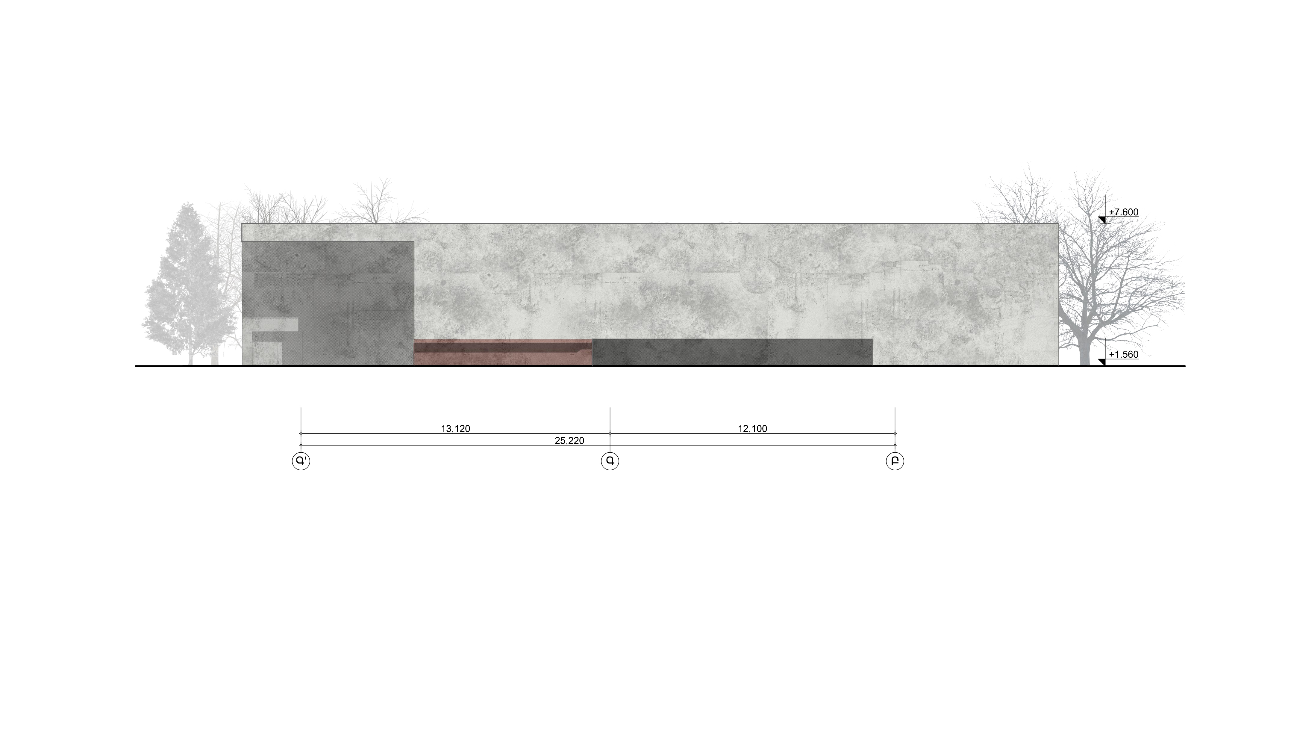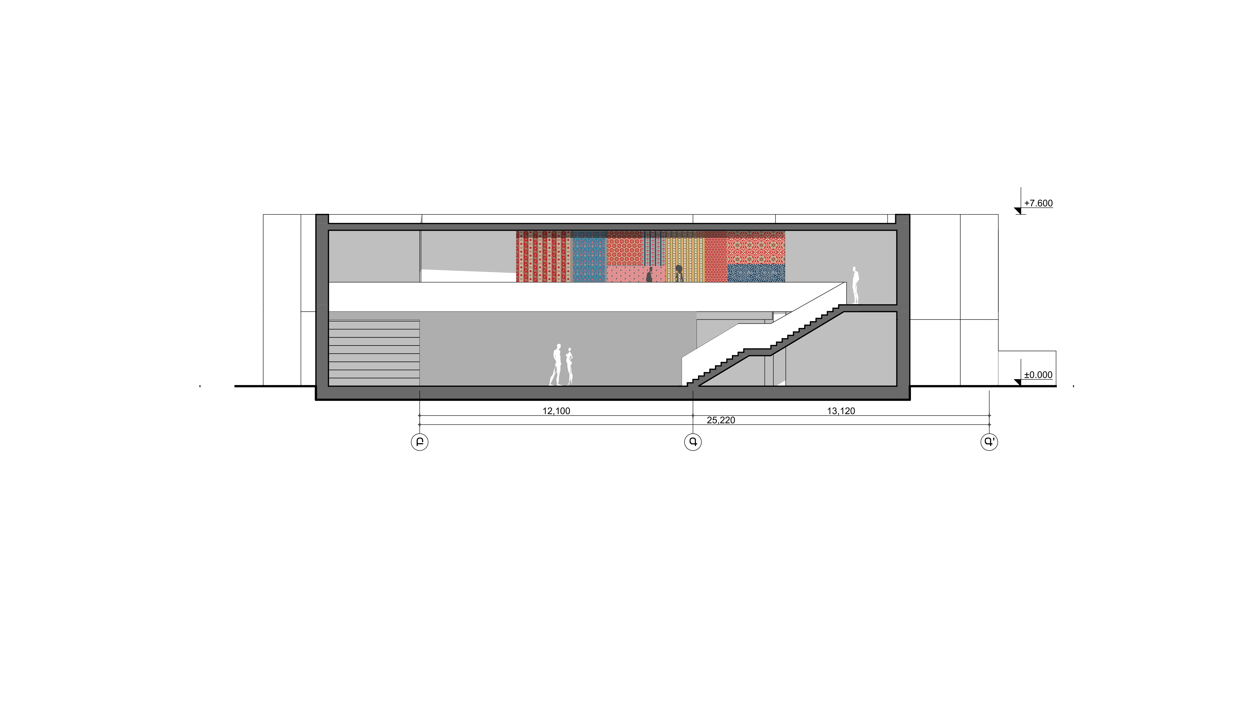 As the main façade opens onto the highway, access to the museum is organized in the middle of the space, where you can relax and wait before watching a show. The light-glazed hall opens into the yard.