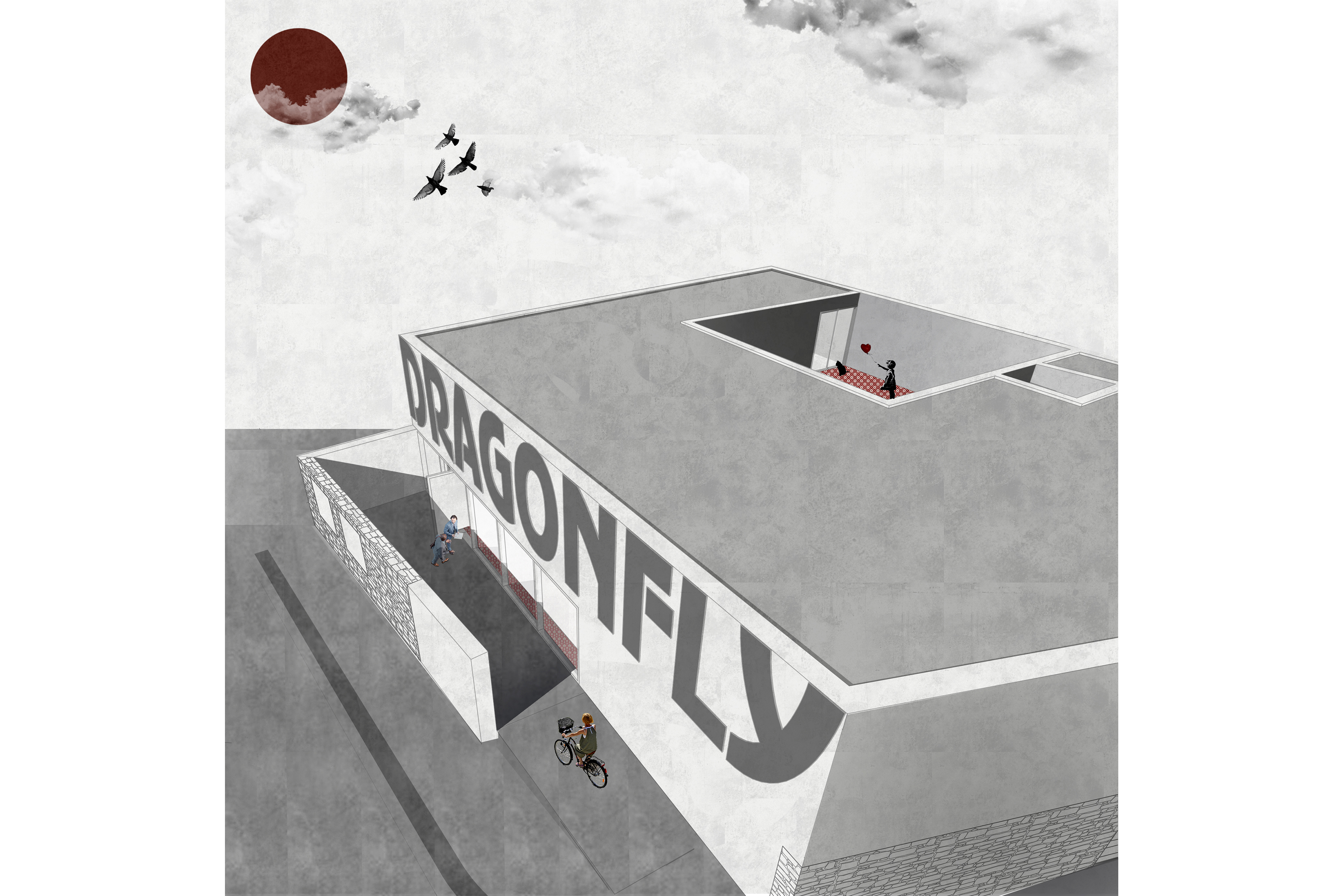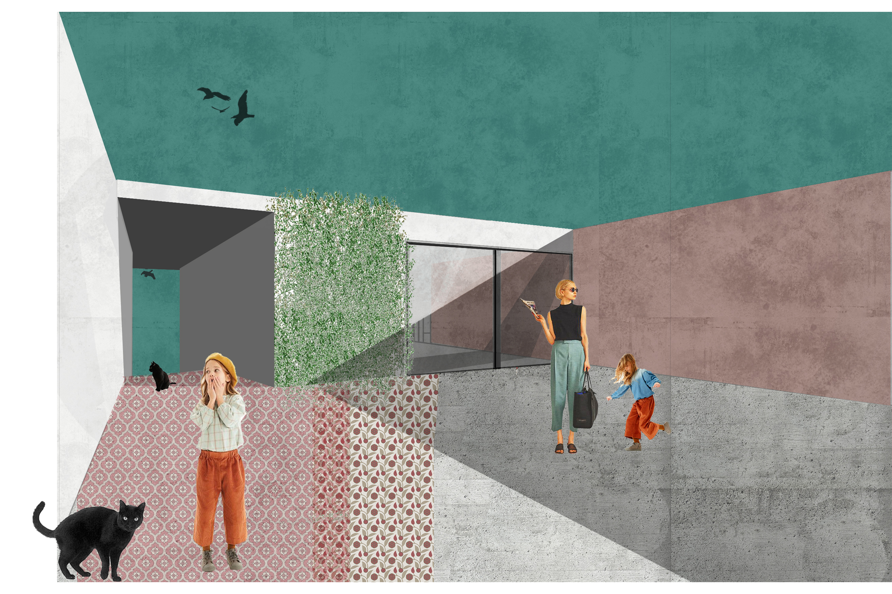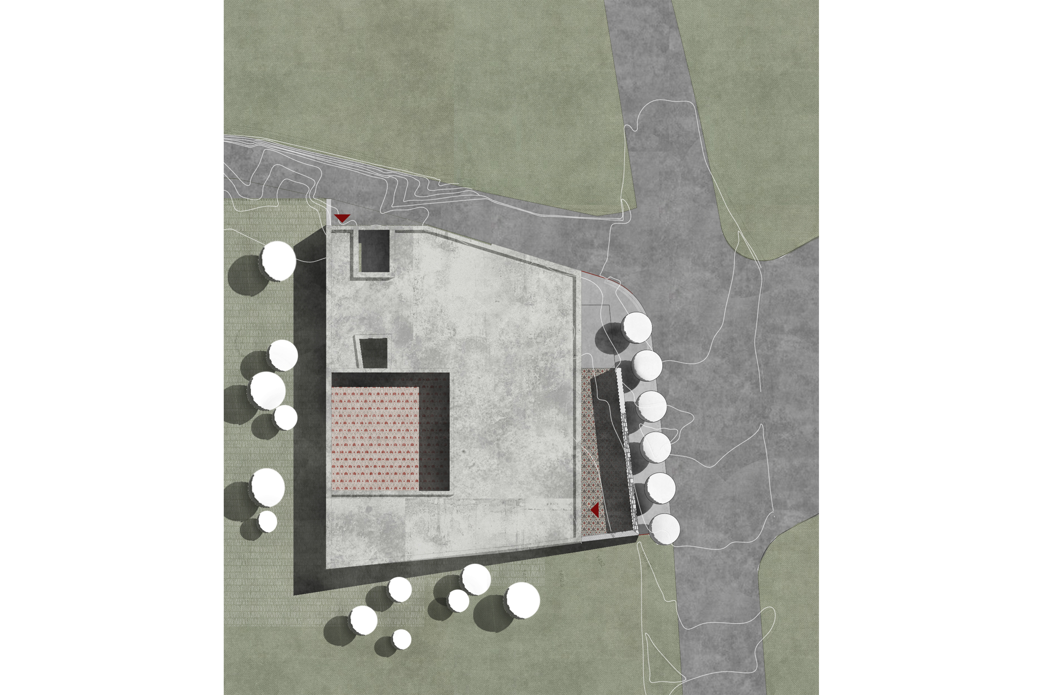 The roof of the hall at the back is exploitable, the cafe and the auditorium-hall open on it.