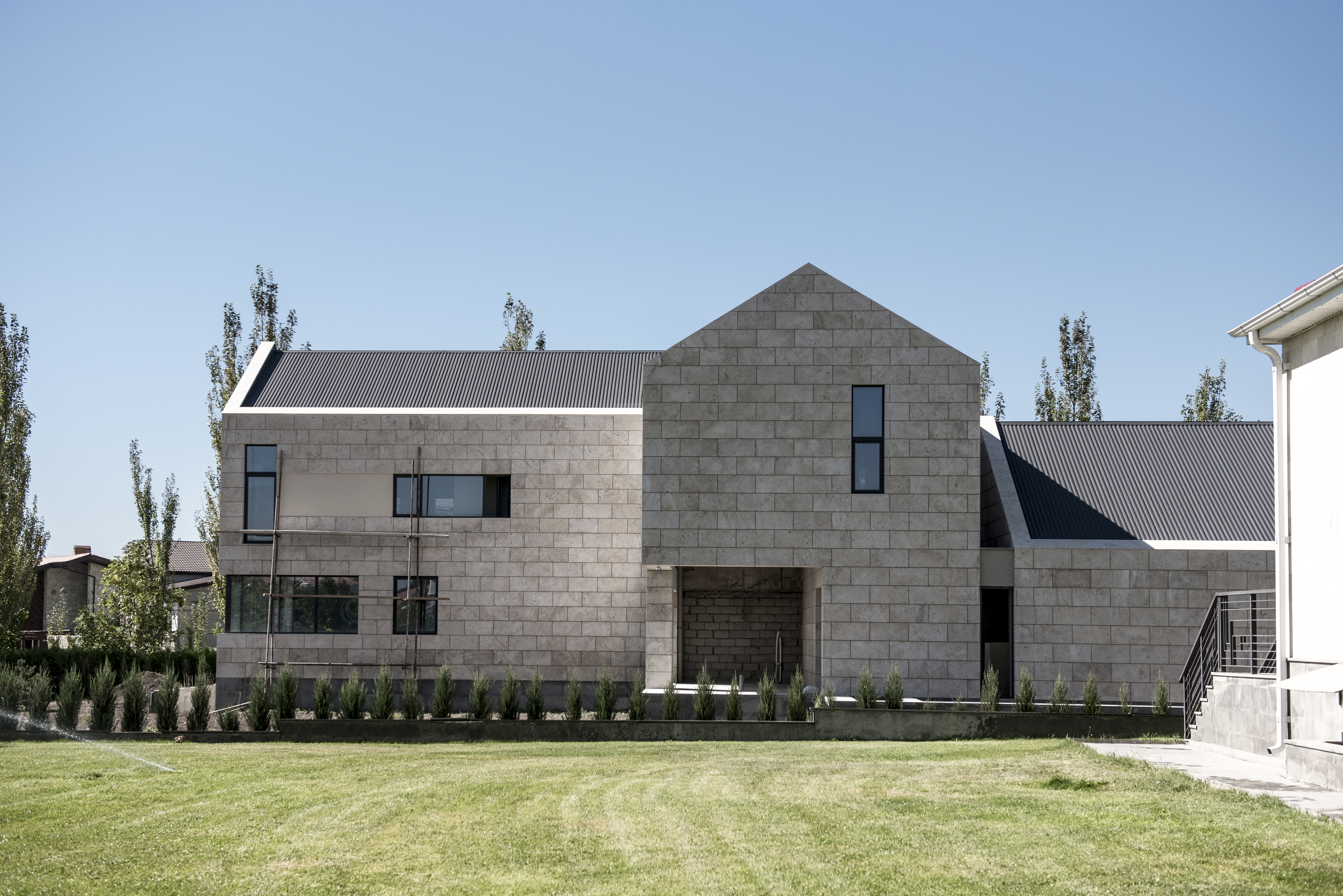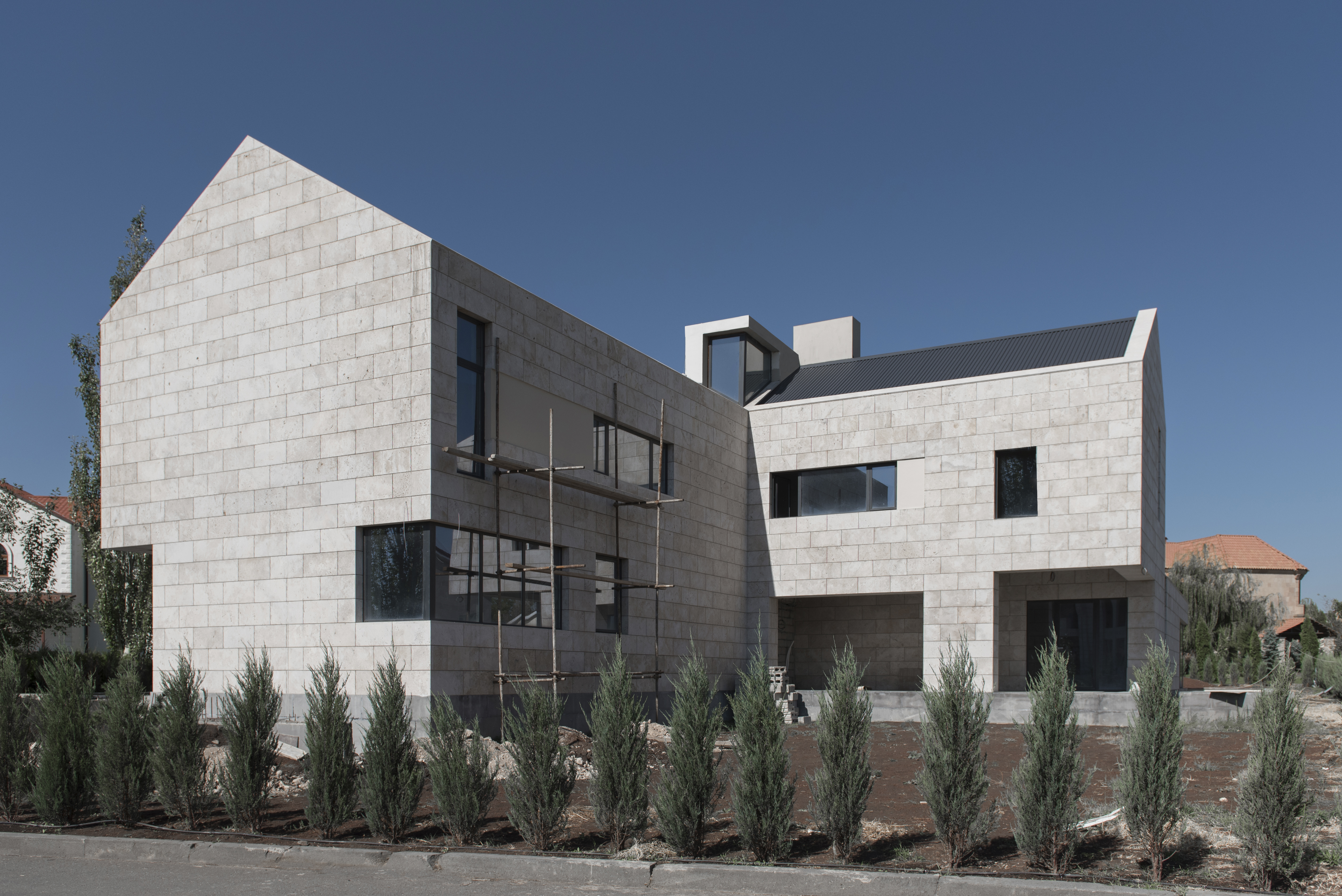 The distinctive peculiarity of the area, where the house owned by Uzunyan family is located, is that the properties here are not fenced, which is not typical for Armenia. The client, however, wished to have relatively isolated outdoor space for recreation area. Taking into consideration the client’s requirements and the context in which the house exists, we suggested the following design solution. The architectural composition consists of three volumes arranged on the same axis in a way that a patio is formed which provides the owner with more privacy and fits the environment. The first two-storey volume contains a garage, a utility room and an entrance hall. The medial in standing single-storey part of the building with the large glazed opening to the patio and swimming pool is designed for a living room, dining room and kitchen. The bedrooms are set in the third two-storey section. The house is built with the local white travertine.